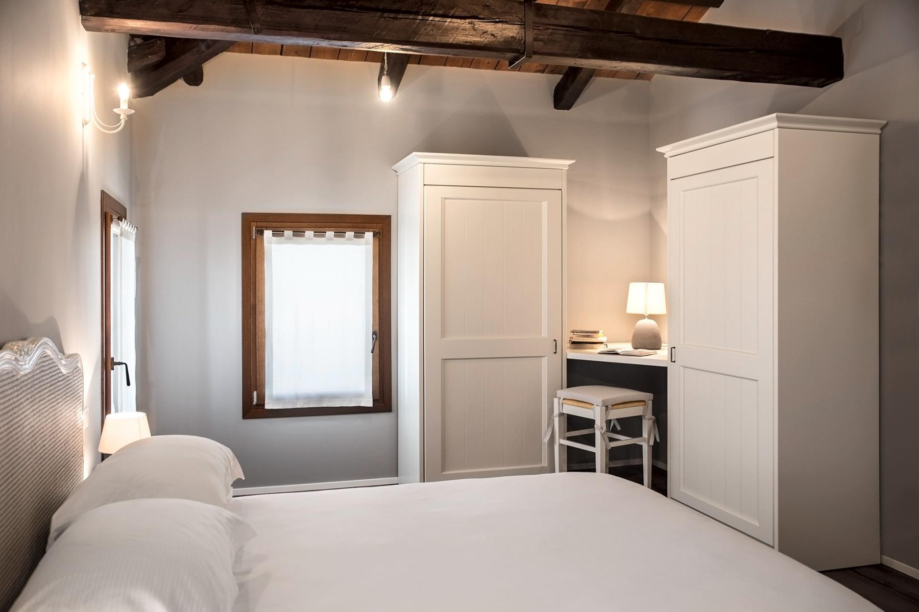 I colori caldi in contrasto con l’arredamento sono le note caratteristiche di questo appartamento con l’affascinante vista sui campi che circondano Ca’ Ciaran.